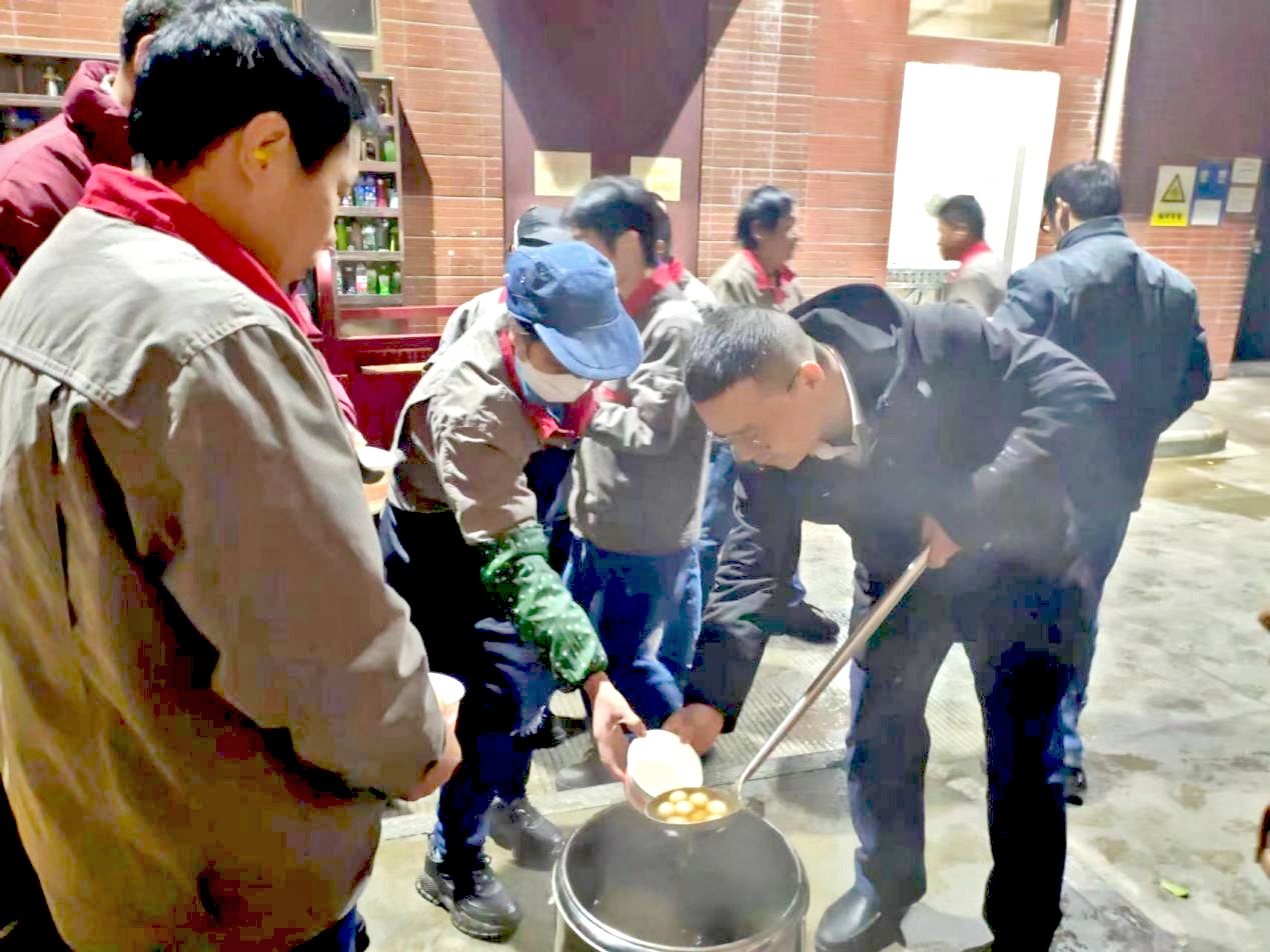 面對員工飽滿的工作熱情,在冬至到來之際的寒冷夜晚,公司人力資源總監胡坤麗與各子分公司工會主席帶著深切牽掛,前往生產一線,向持續奮戰的員工表示關心和問候。各公司工會細心地為員工們準備了熱乎的紅糖水和甜甜糯糯的湯圓,希望這傳統的冬至食品能為辛勤工作的員工們驅散寒冷,帶來一絲家的溫馨。